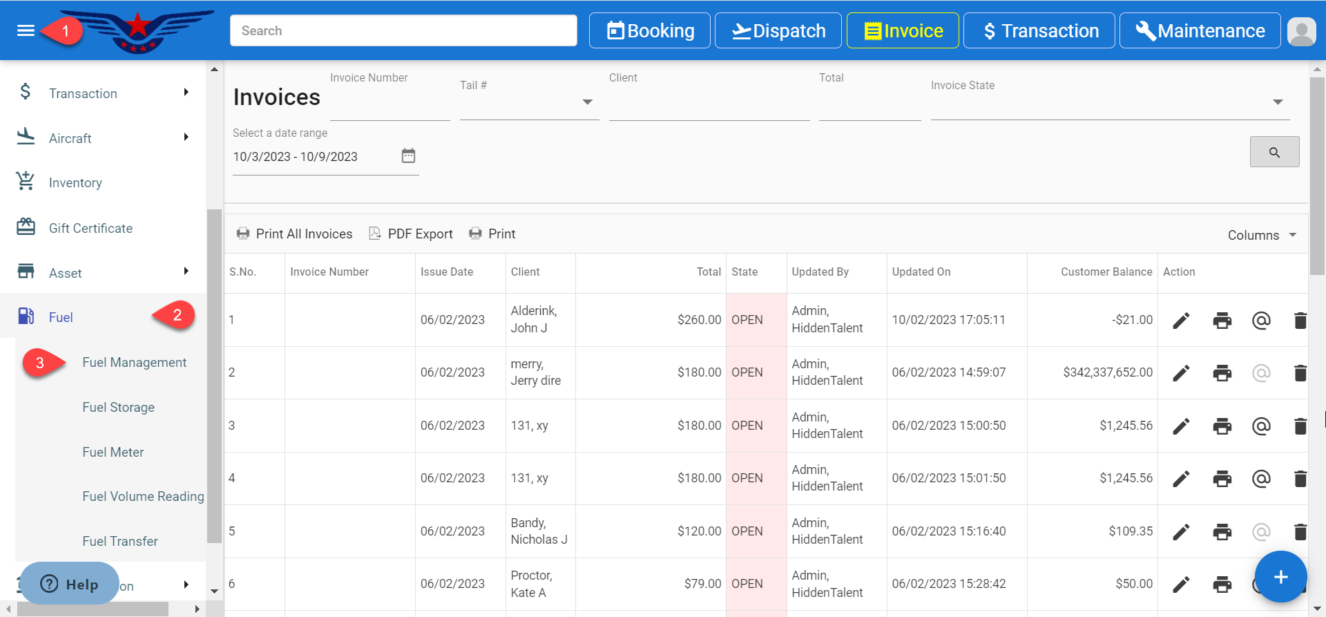 - Click on the hamburger icon on the top left corner of the navigation bar [1]. Select Fuel main menu [2]. Click on the Fuel Management sub menu [3].