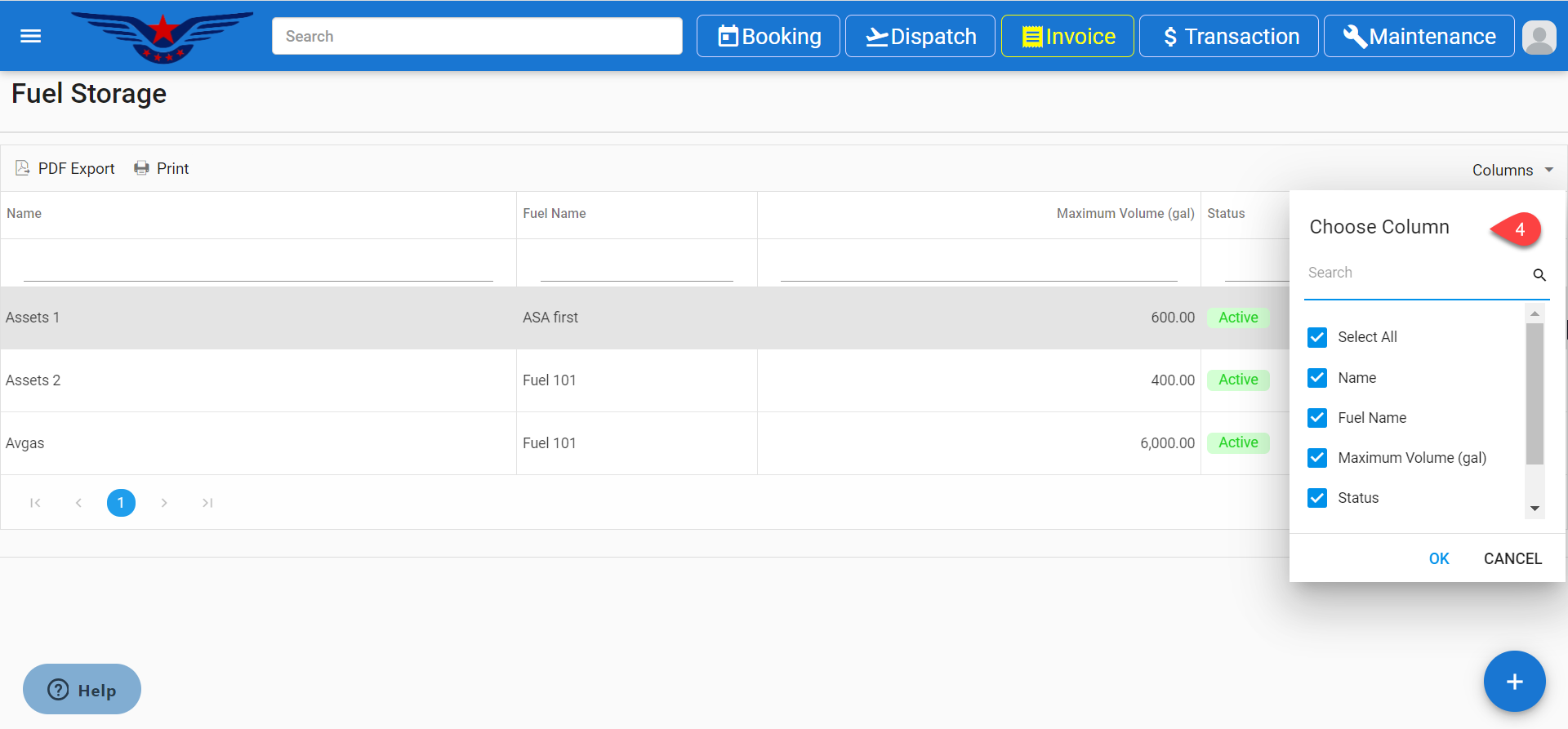- Fuel Storage List can be viewed with the desired columns by selecting the columns from the Column drop down list [4], then click on the OK button.