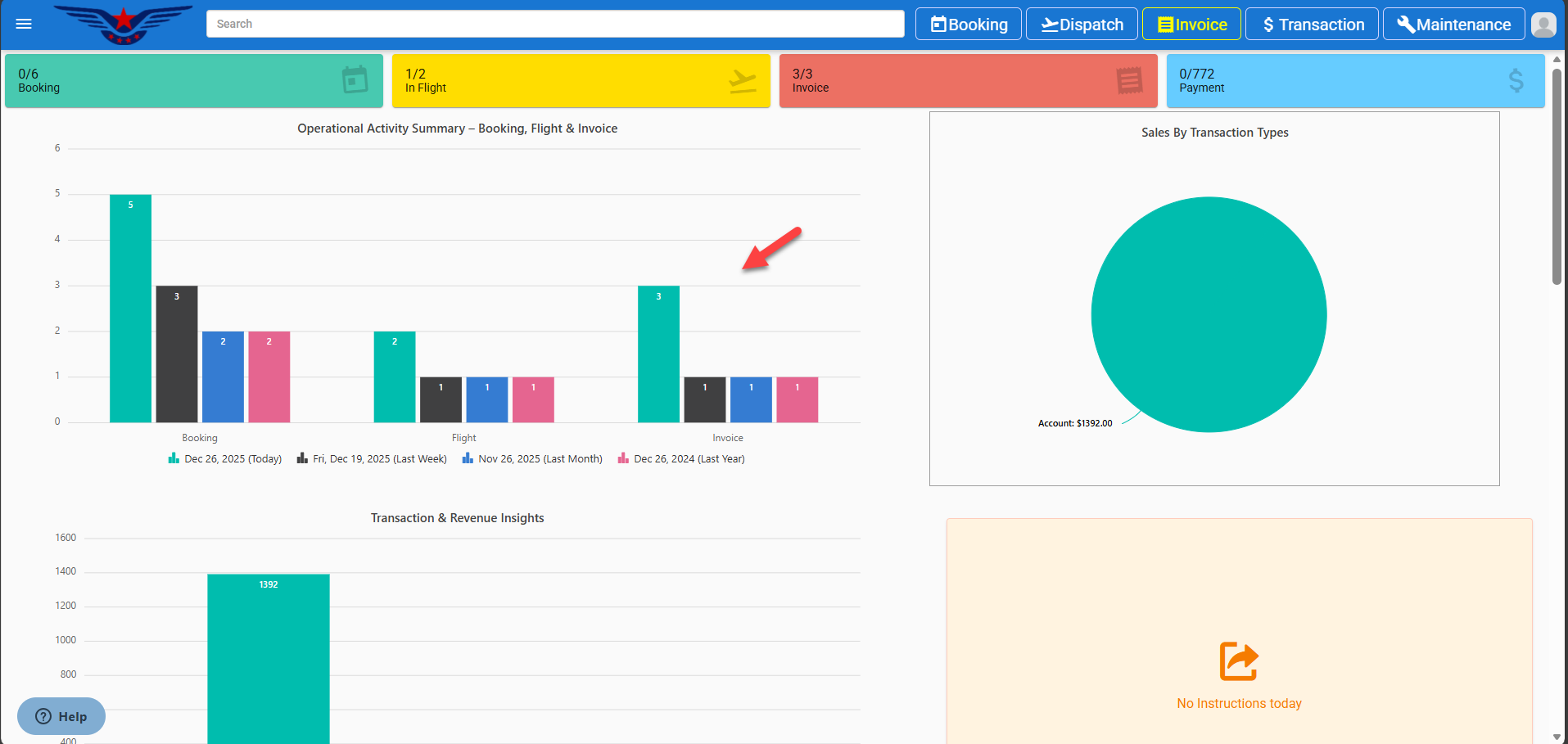 Bar chart display data of bookings, flights and invoices on dashboard.