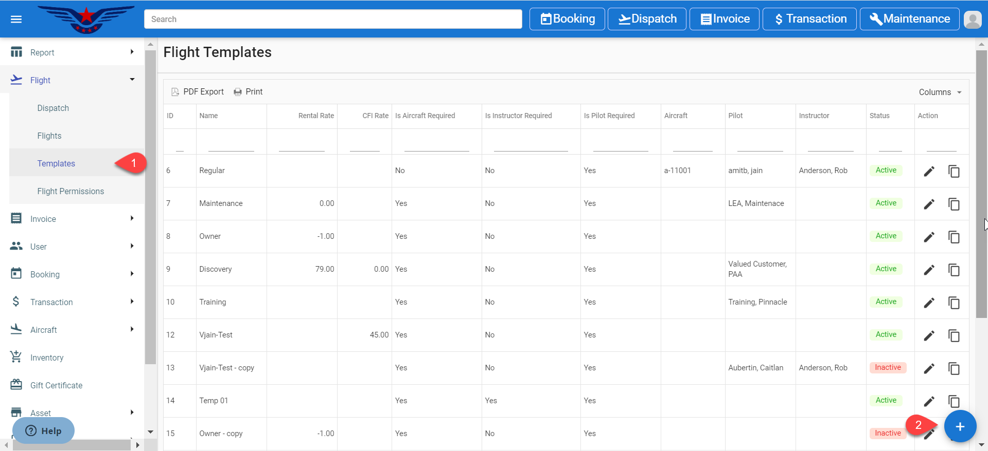 - Flight Template List will be displayed on the screen, click on the ( + ) button on the bottom right corner.