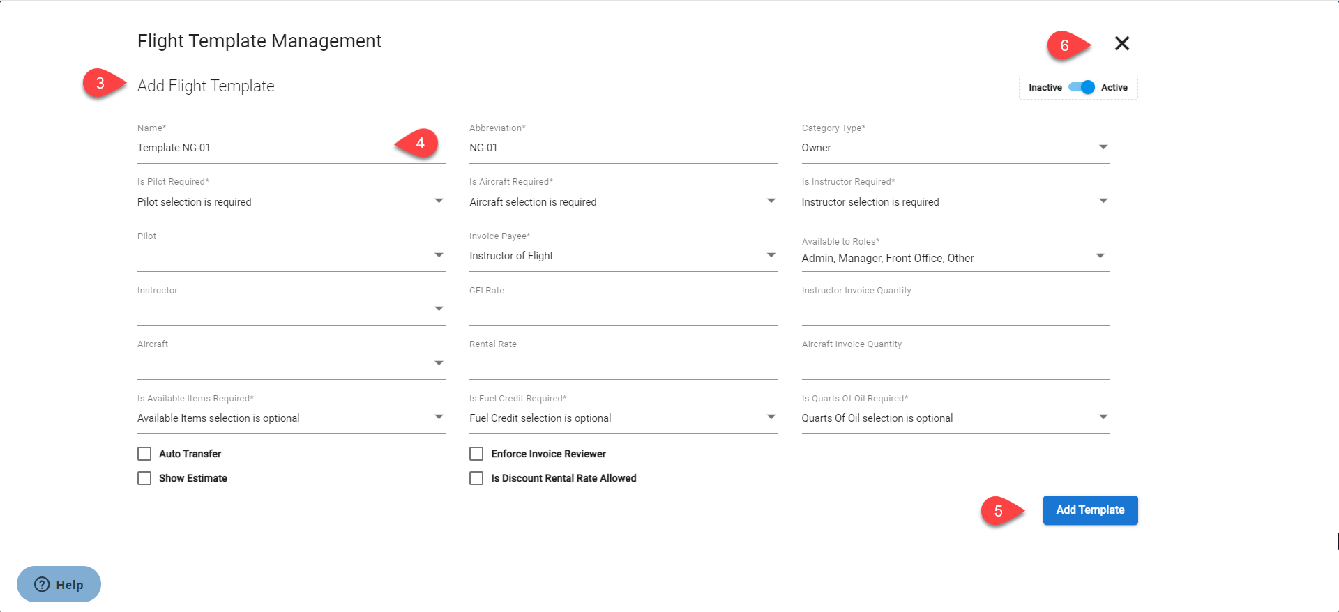 - Fill up all the mandatory fields i.e. Name, Abbreviation Category Type, Invoice Payee, Available to Roles, Is Pilot Required, Is Aircraft Required, Is Instructor Required etc. Make sure to enter all the mandatory information.