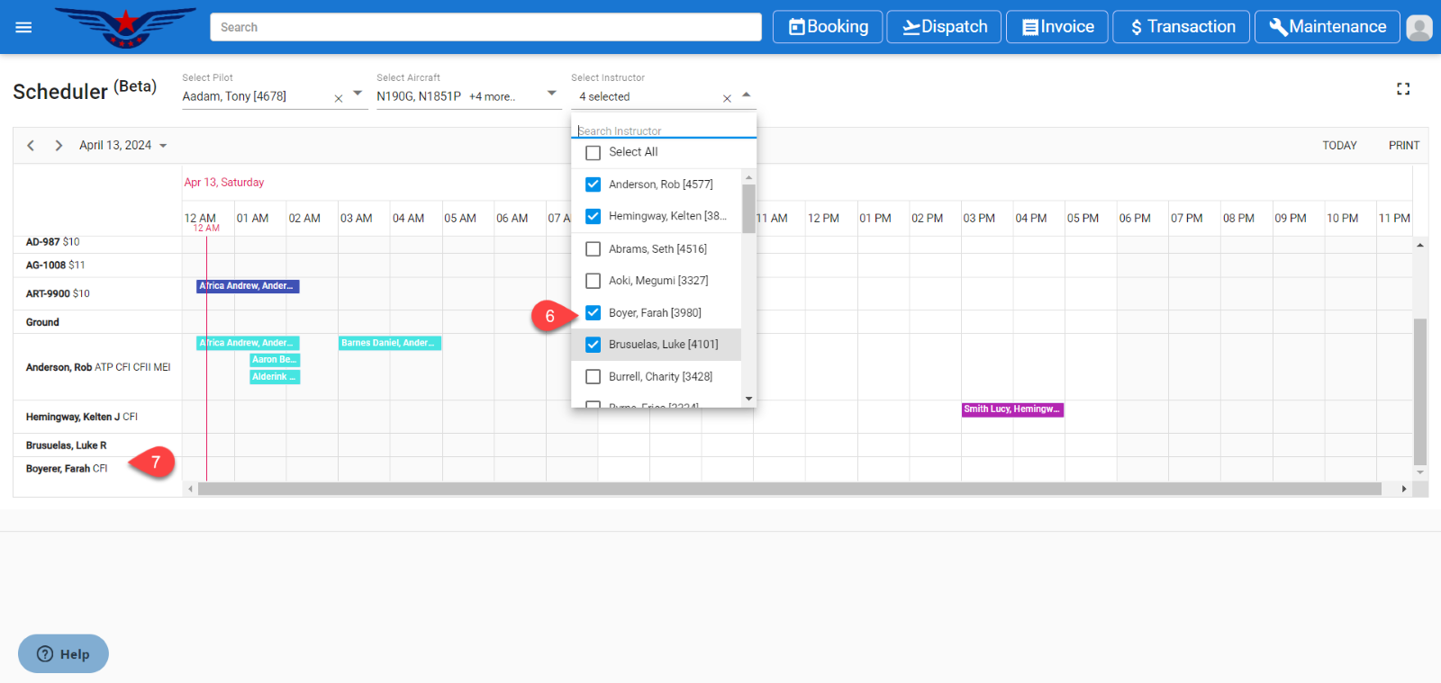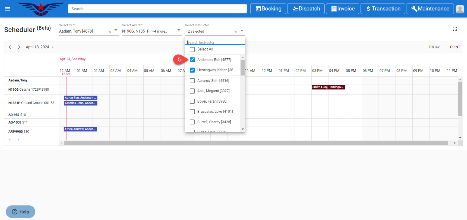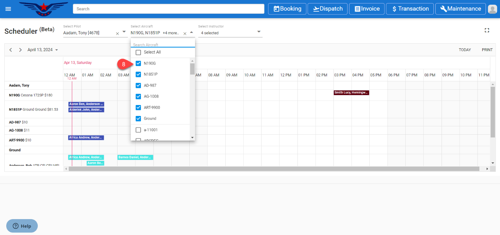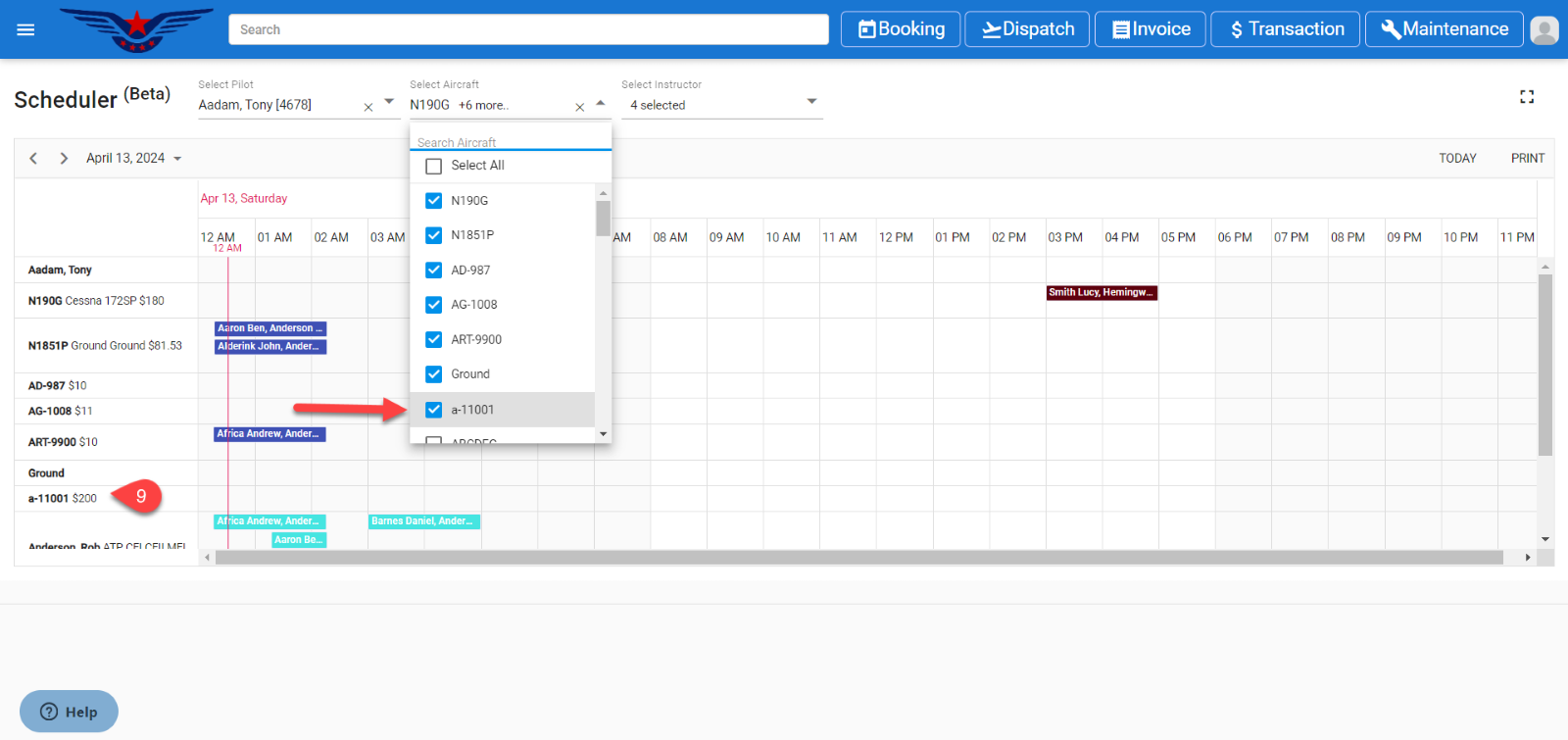 Click on the Aircraft multiselect drop down and it will display the aircraft list. Select the aircraft. The aircraft which is having scheduled booking will be auto selected in the drop-down list.