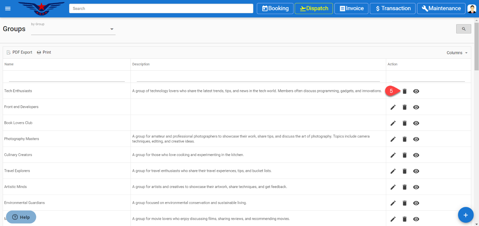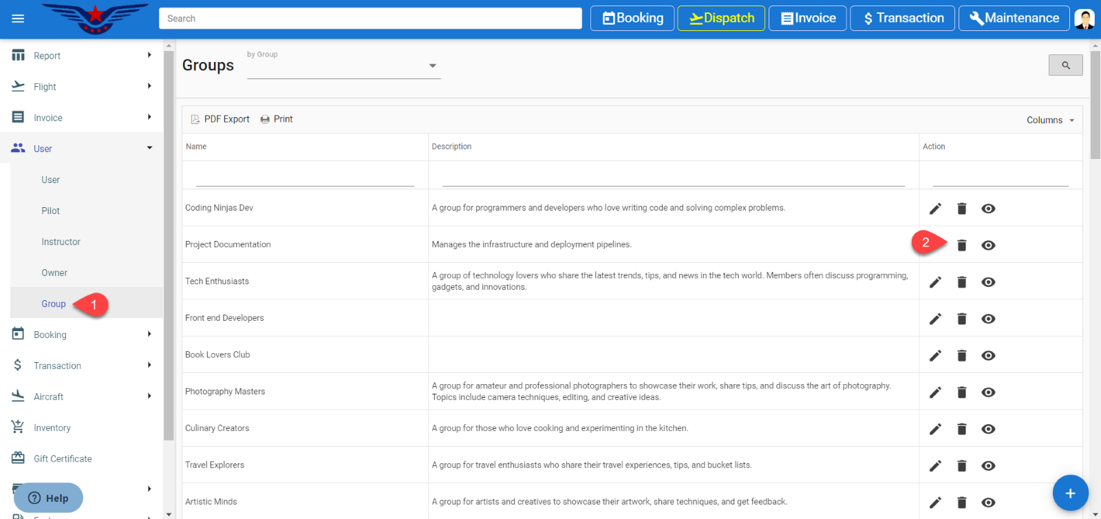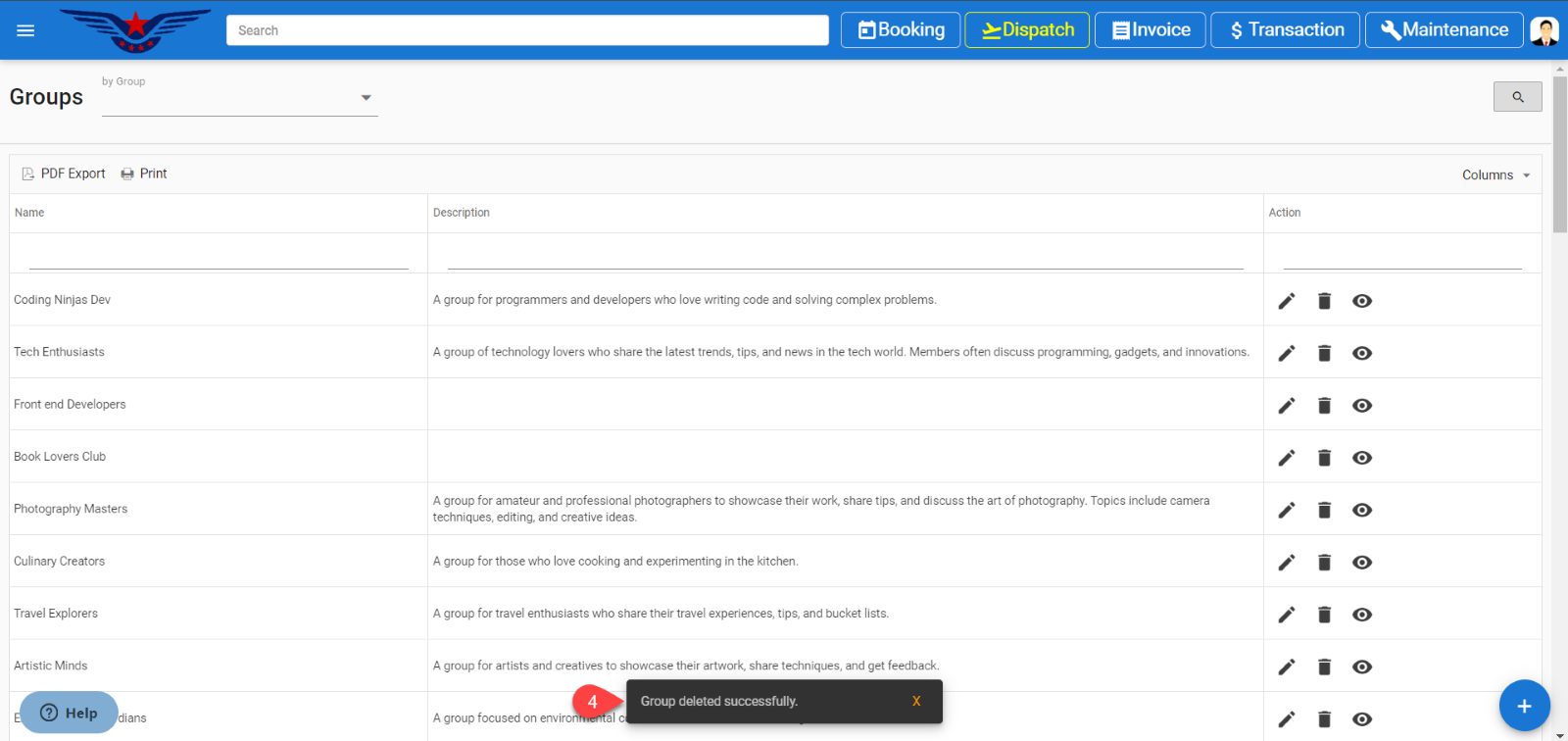 Group list will be displayed, click on the Delete icon under the action column of the list.