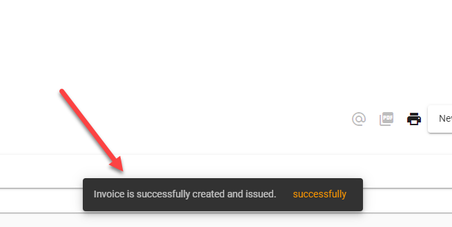 - Successful invoice created message will pop on the bottom center of the screen.
