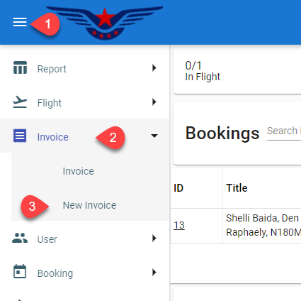 Click on the hamburger icon on the top left corner of the navigation bar[1]. Select the Invoice main menu[2]. Click on the New Invoice sub main menu[3].