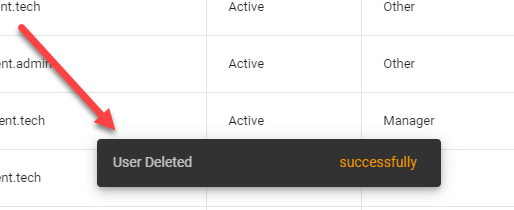 - User deleted successfully message will pop up on the bottom center of the screen.
