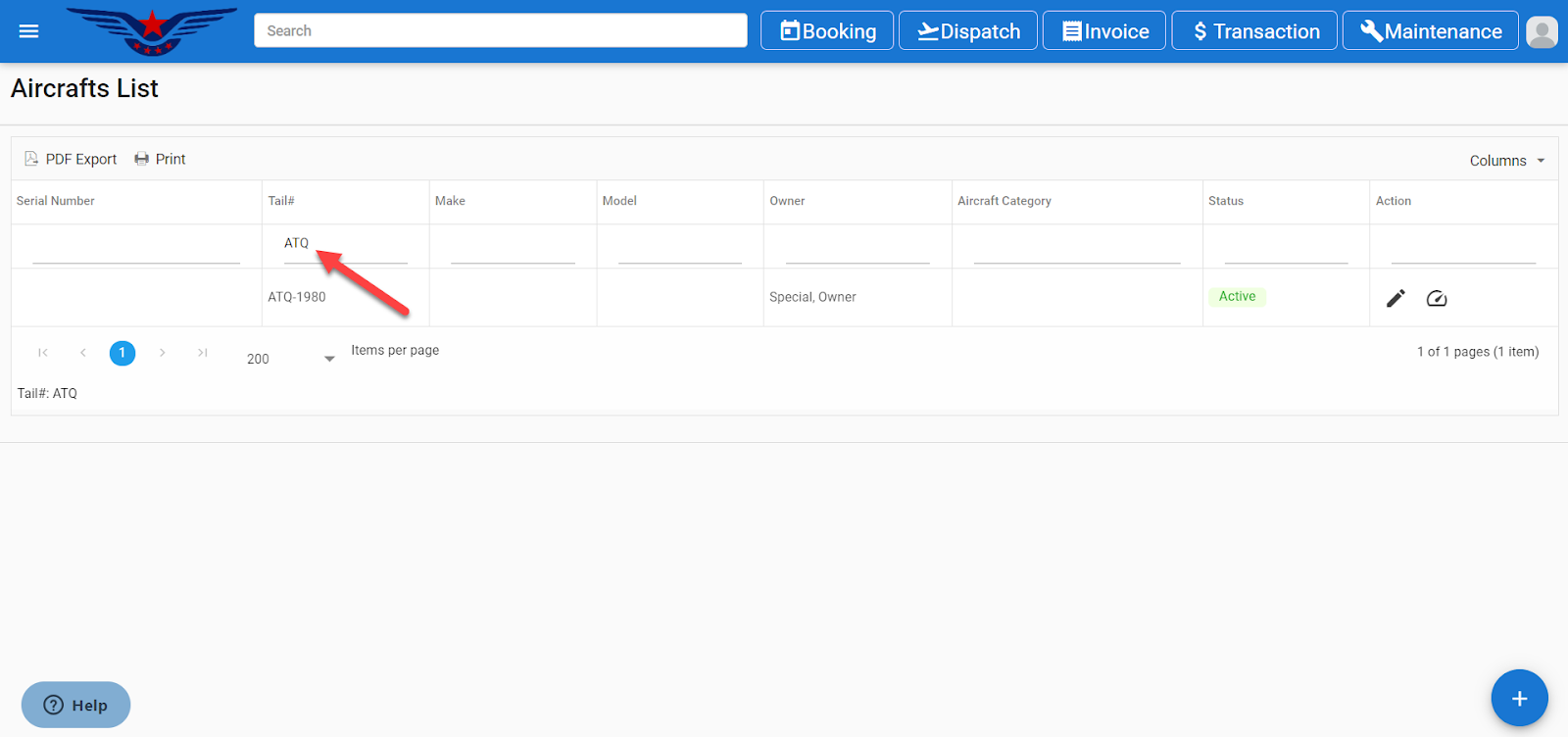 - List can be viewed by searching the Serial Number, Tail Number, Make, Model, Owner, Aircraft Category, and Active/ Inactive status.