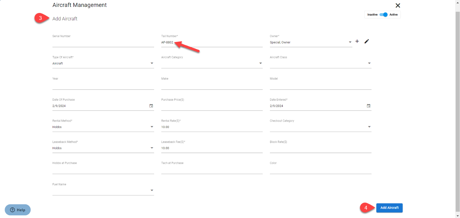 - Add Aircraft page will open on the screen. Fill up all the mandatory fields i.e. Tail number, Select the Owner, type of aircraft from Type of Aircraft dropdown list, enter the Rental Rate ($), select rental method from Rental Method drop down list, enter the leaseback fees ($), select the leaseback method from Leaseback Method drop down list.