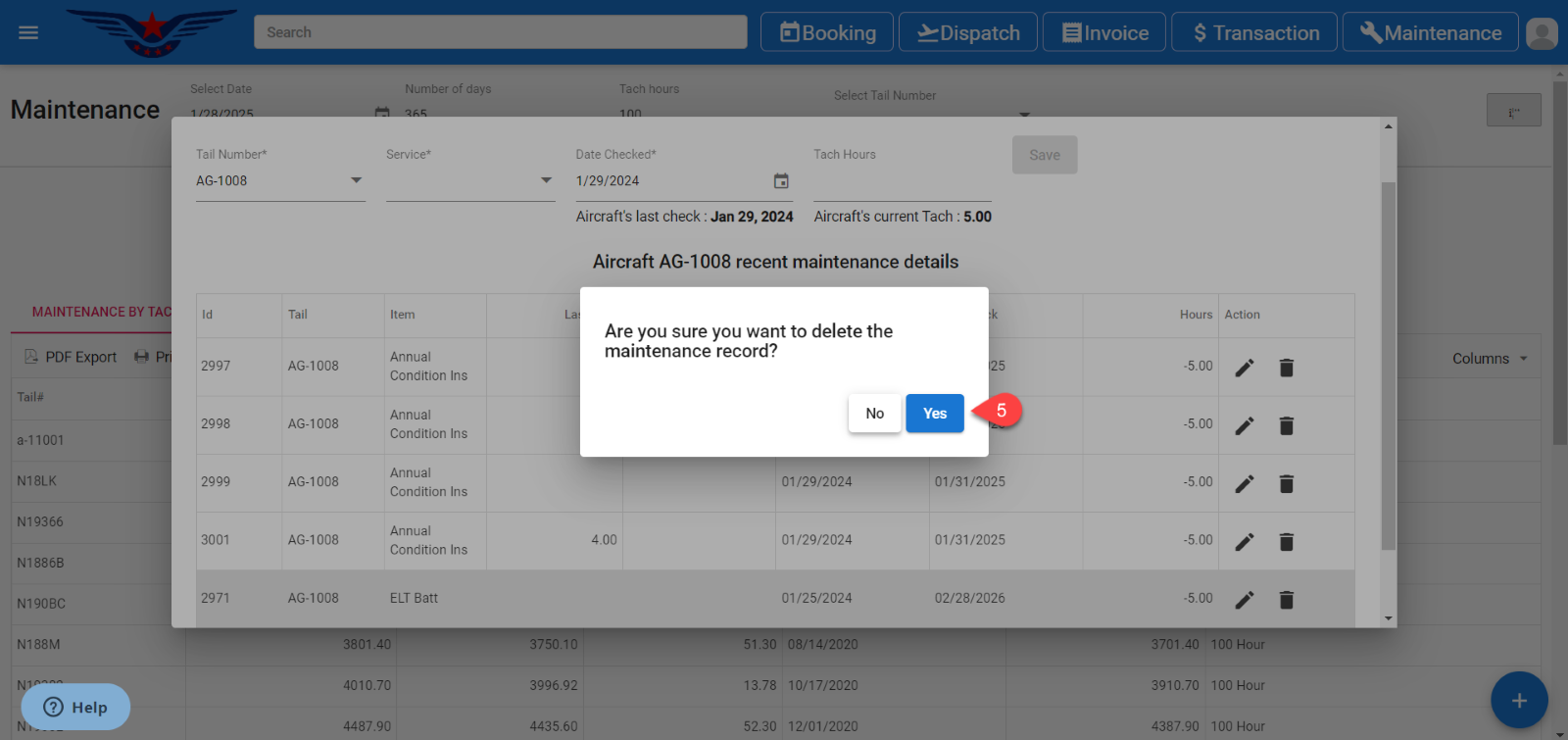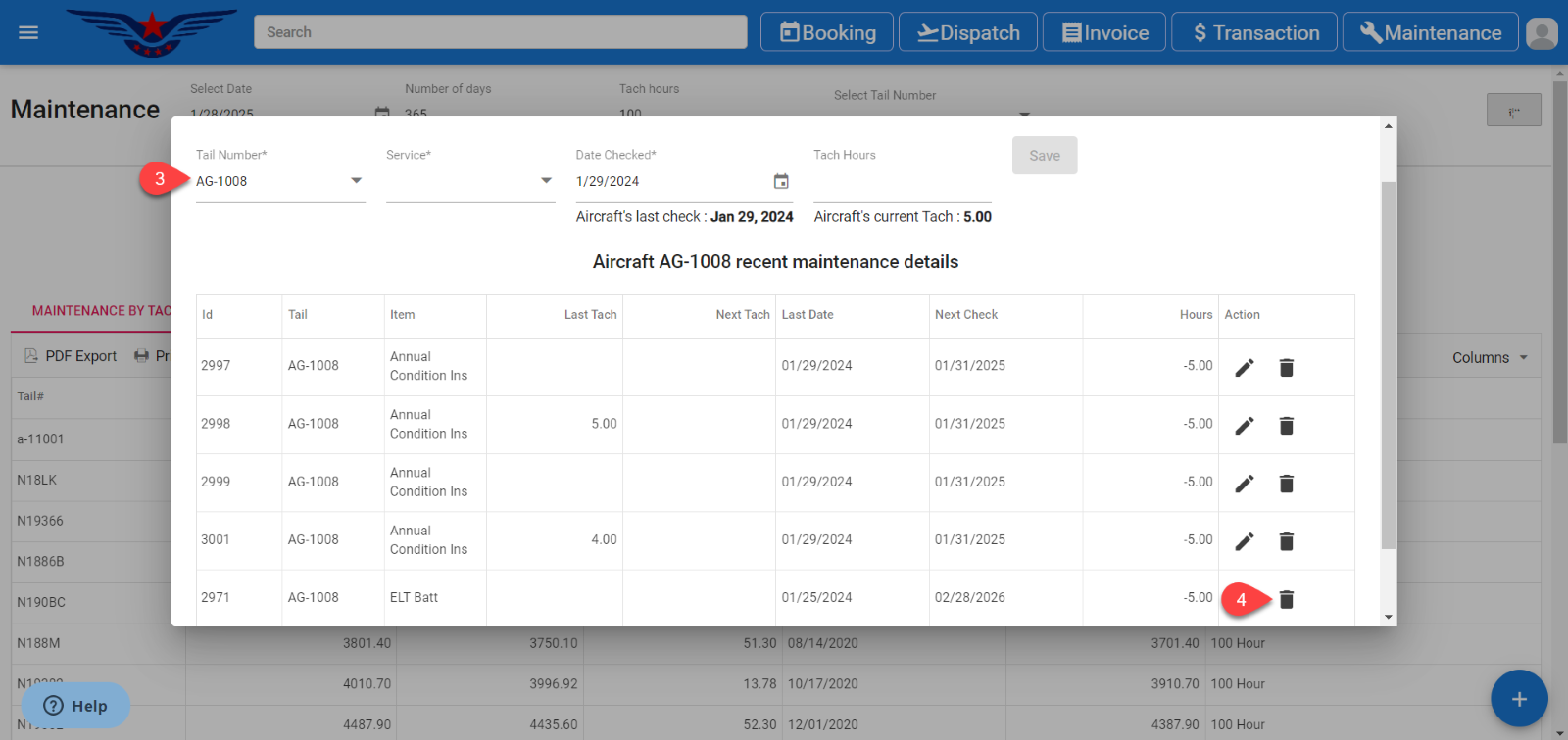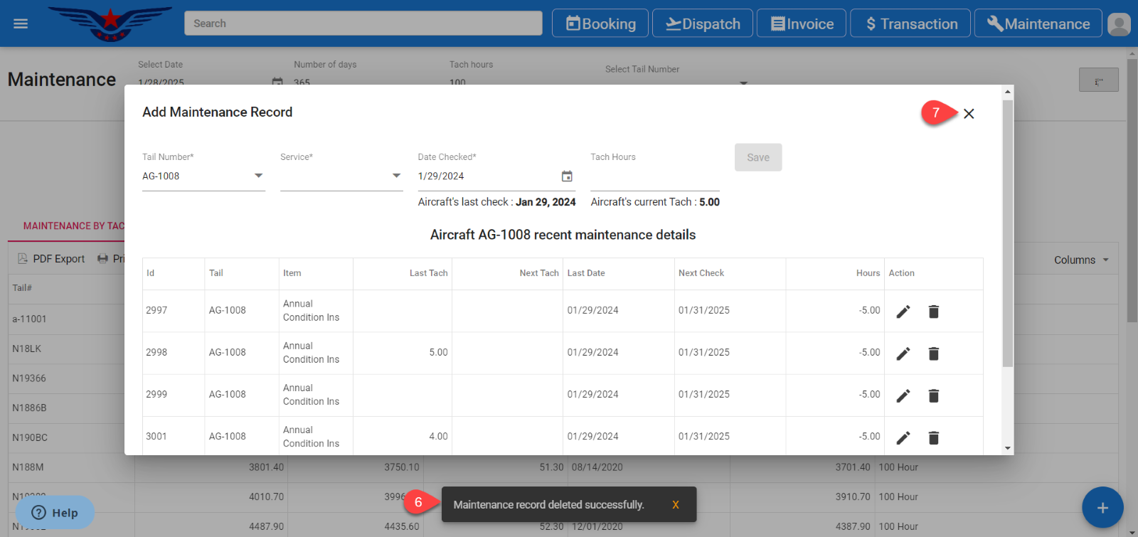 - The recent maintenance records list of that aircraft will be displayed. Click on the Delete icon under the action column of the list.