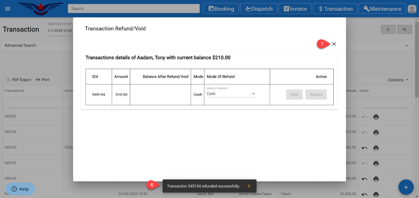 - Click on the X icon to close the refund/ void transaction sheet.