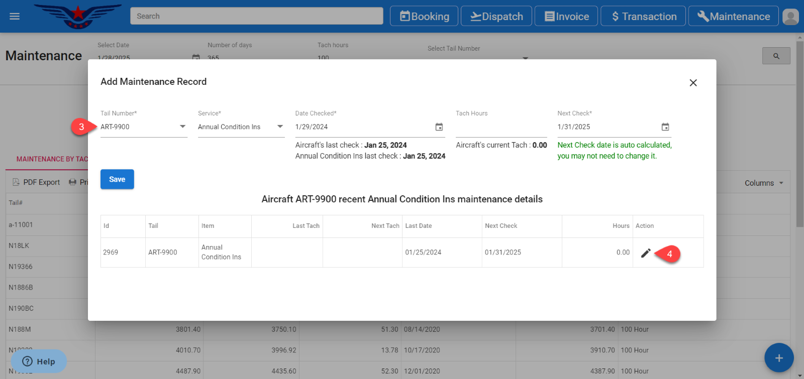 - The recent maintenance records list of that aircraft will be displayed. Click on the Pencil icon under the action column of the list.