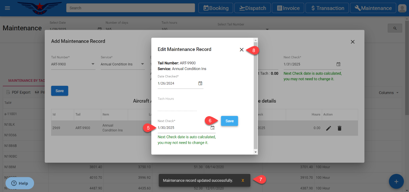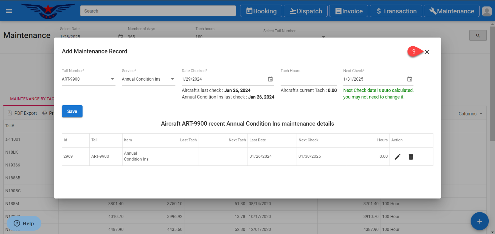 - The Add Maintenance Record pop up will display. Select a Tail Number from the Tail Number drop down whose maintenance record is to be edited.