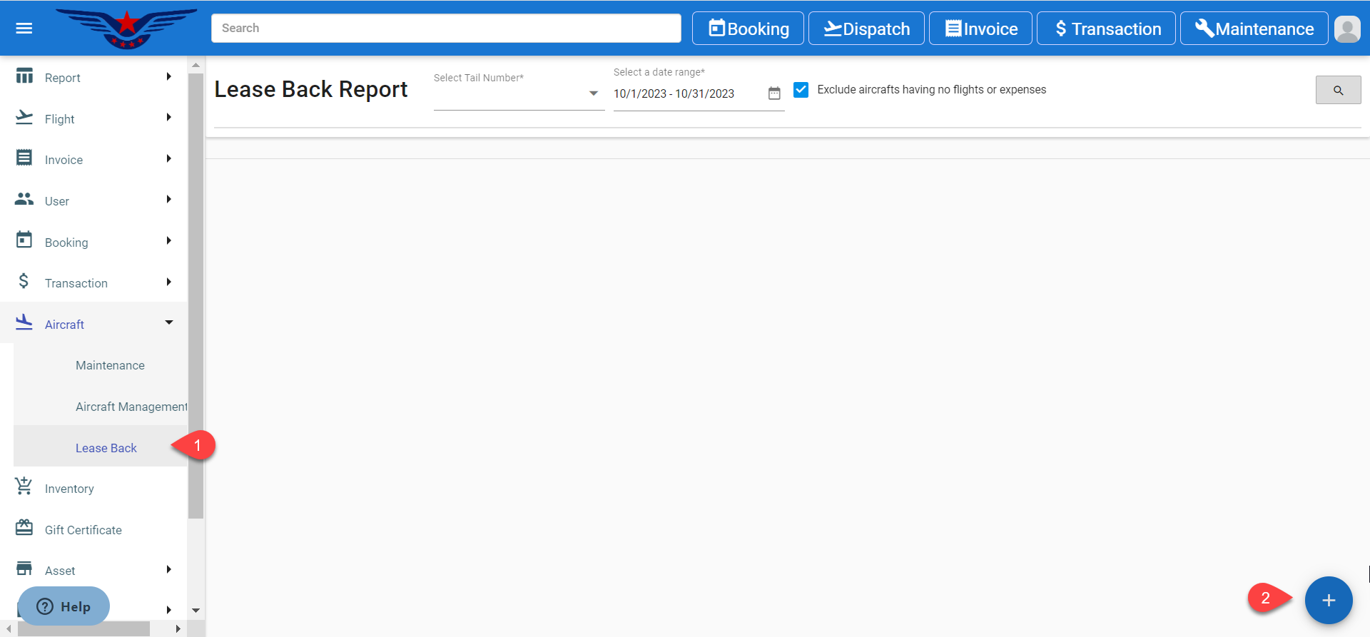 - Click on the hamburger icon on the top left corner of the navigation bar. Select Aircraft main menu. Click on the Lease Back sub menu.
