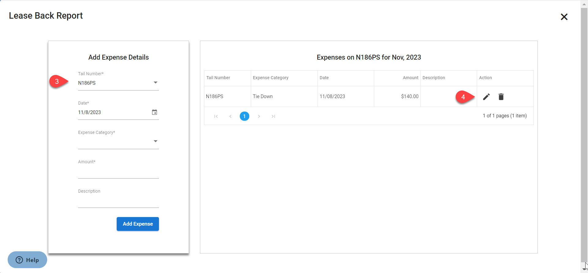 - Add Expense Detail page will open. Select the Tail Number whose expense details are to be edited.