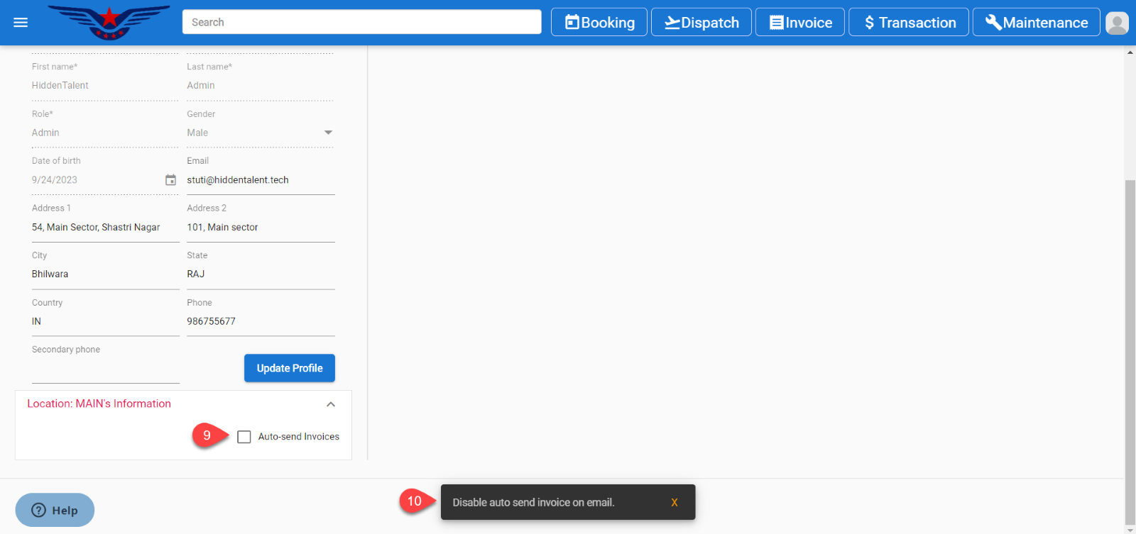 - Uncheck the checkbox Auto-send Invoices to not receive invoices on email for the respective student on invoice payment.