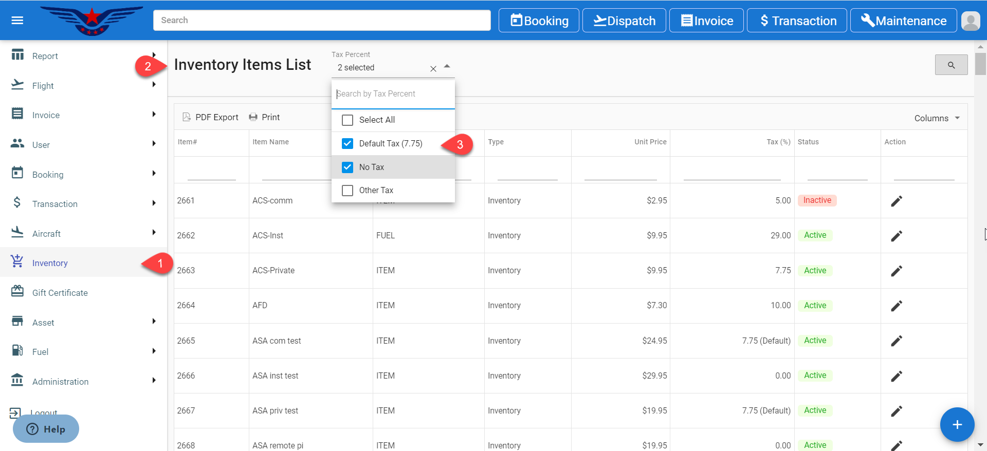 a. Default Tax: Default Tax is set according to the respective locations. Select Default Tax to view list of items with default tax.