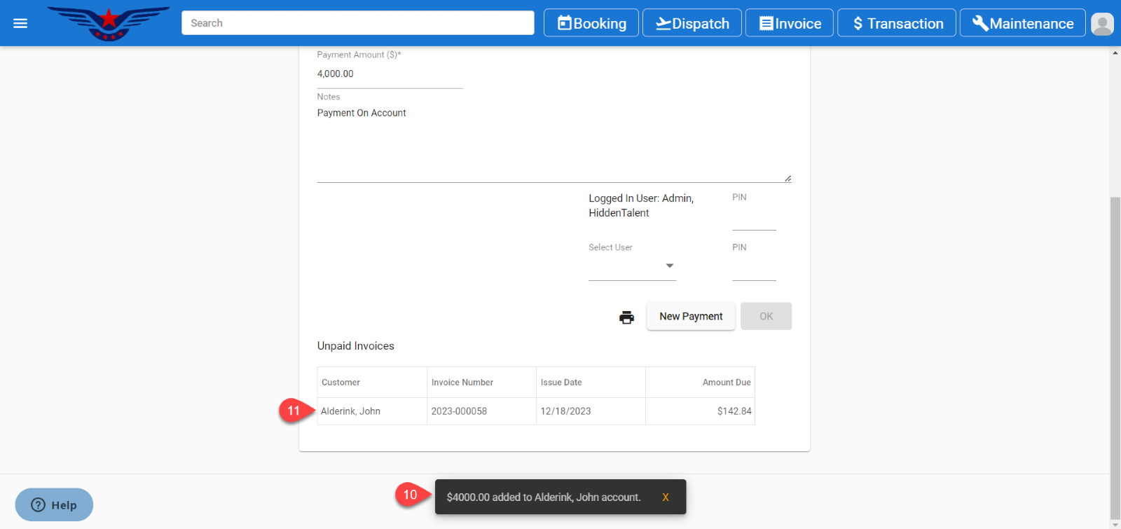 - All the previous unpaid invoices of that respective Customer will be displayed in the table.