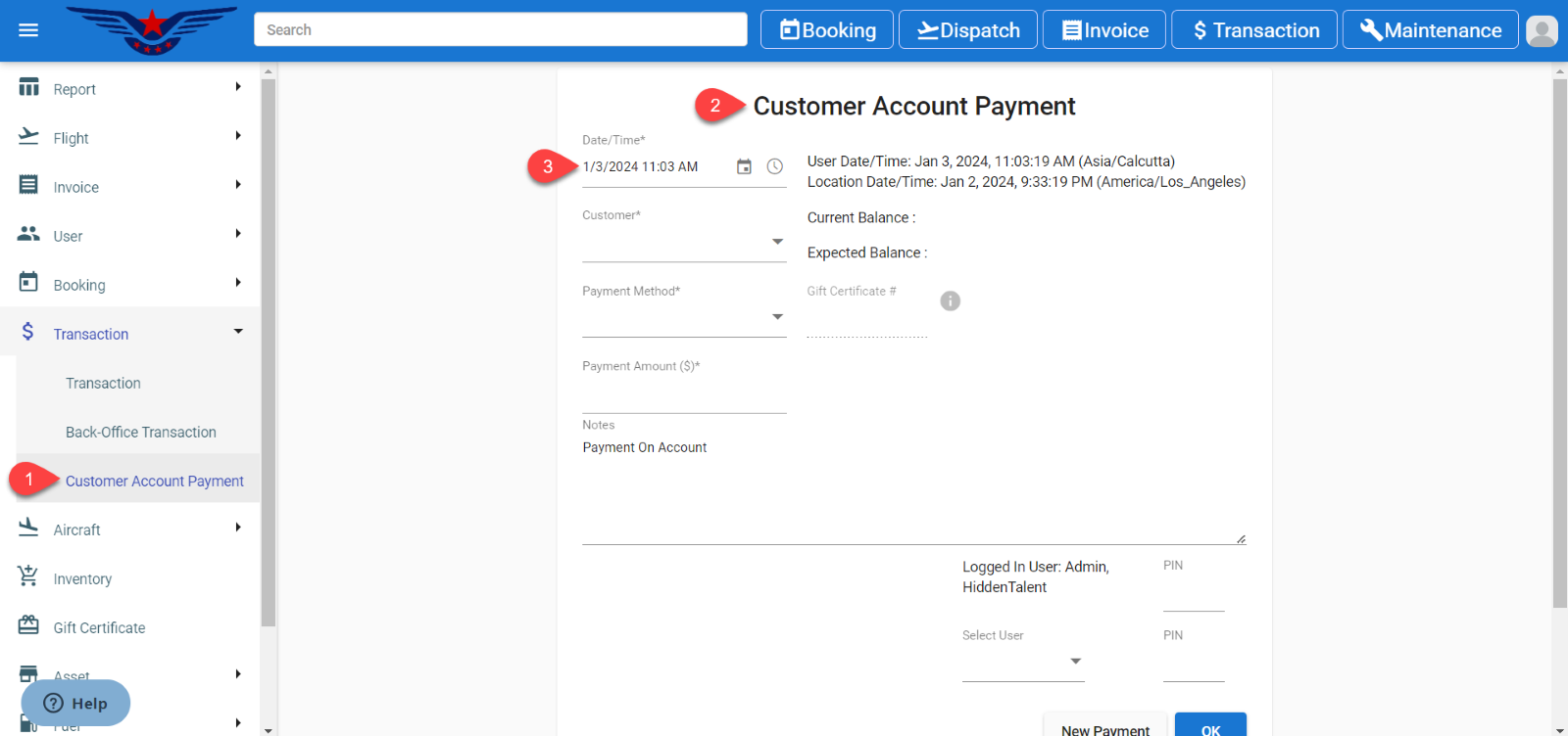 - Click on the hamburger icon on the top left corner of the navigation bar. Select the Transaction main menu. Click on the Customer Account Payment sub menu.
