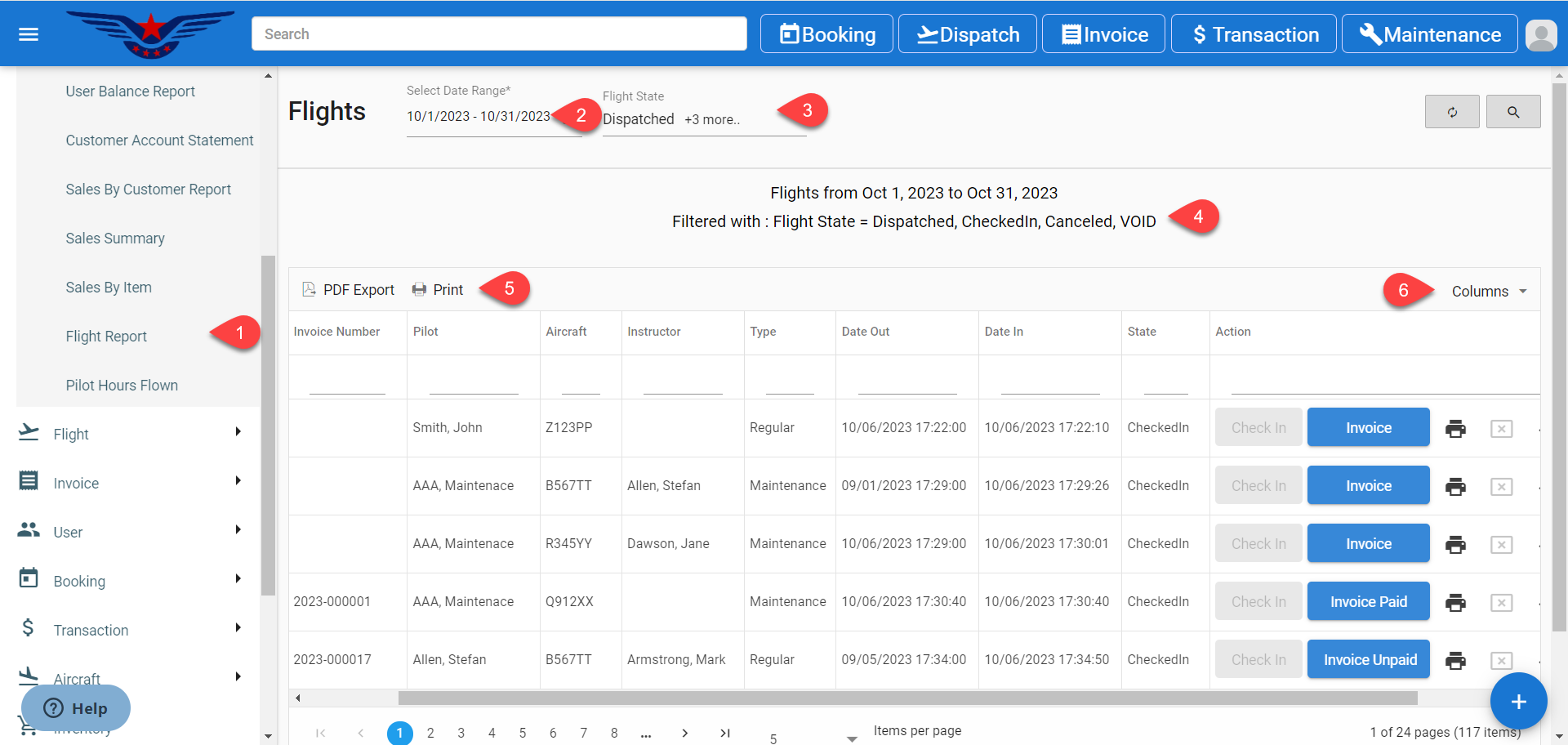 - Click on the hamburger icon on the top left corner of the navigation bar. Expand Report main menu. Click on the Flight Report sub menu.