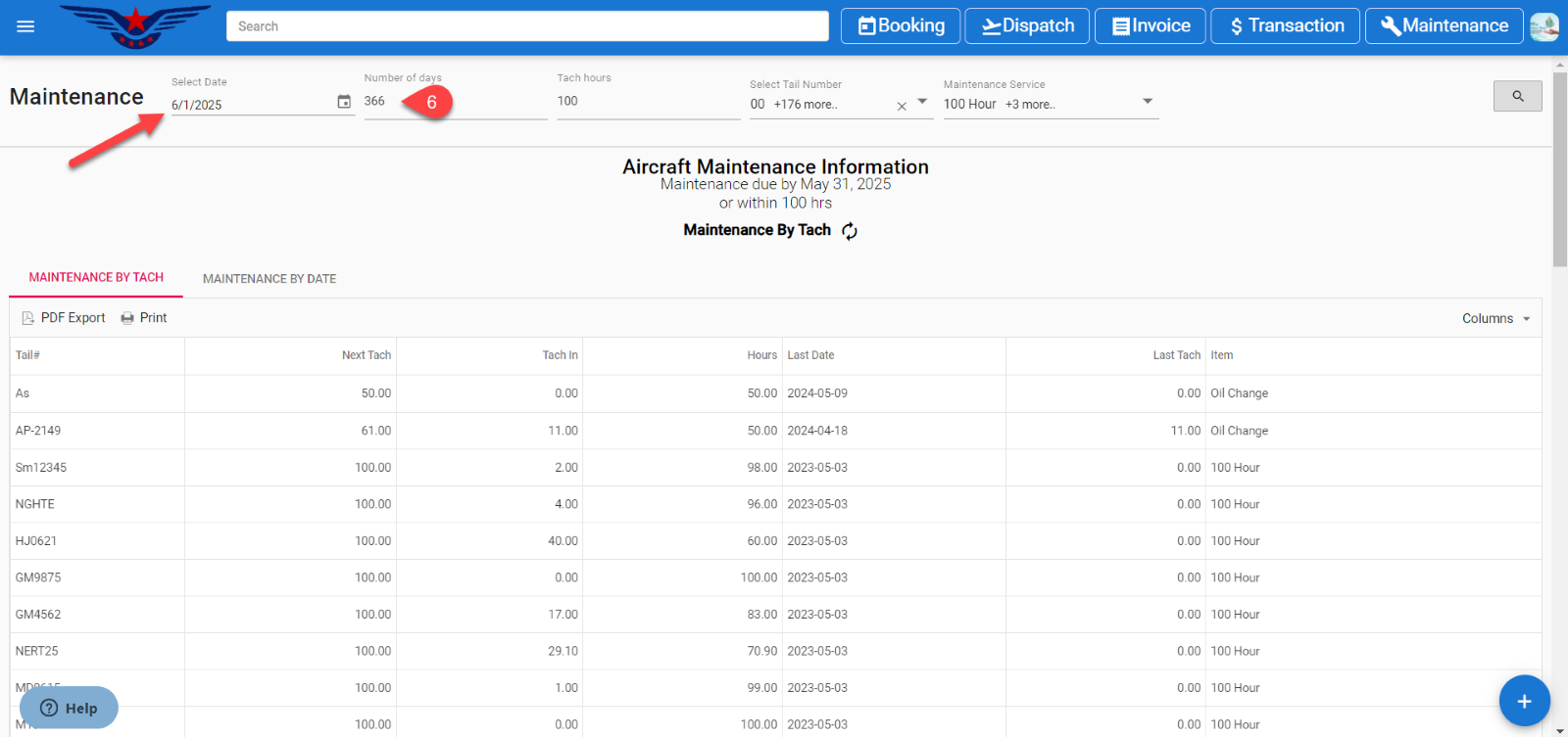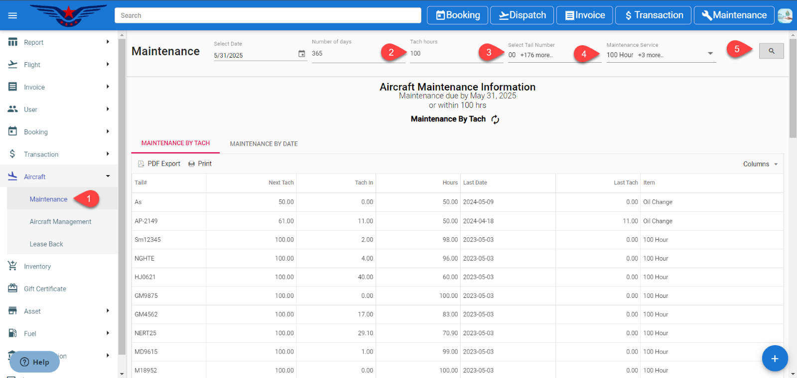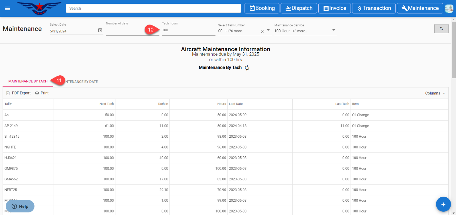 - Click on the Maintenance By Tach tab. It will display the Maintenance Report according to the provided Tach hour.