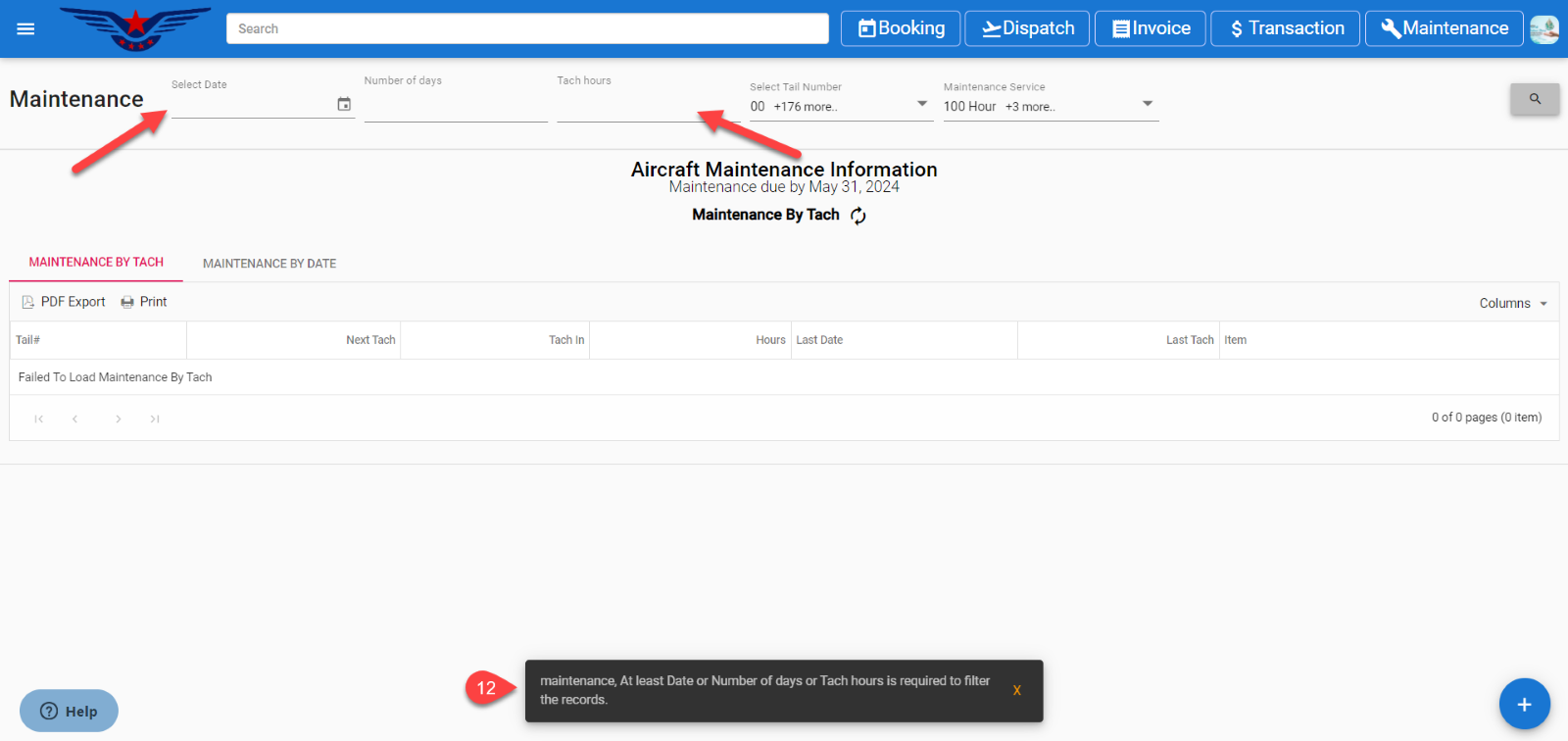- Remove Date, Number of days and Tach hours, then click on the search button. It will display the message.