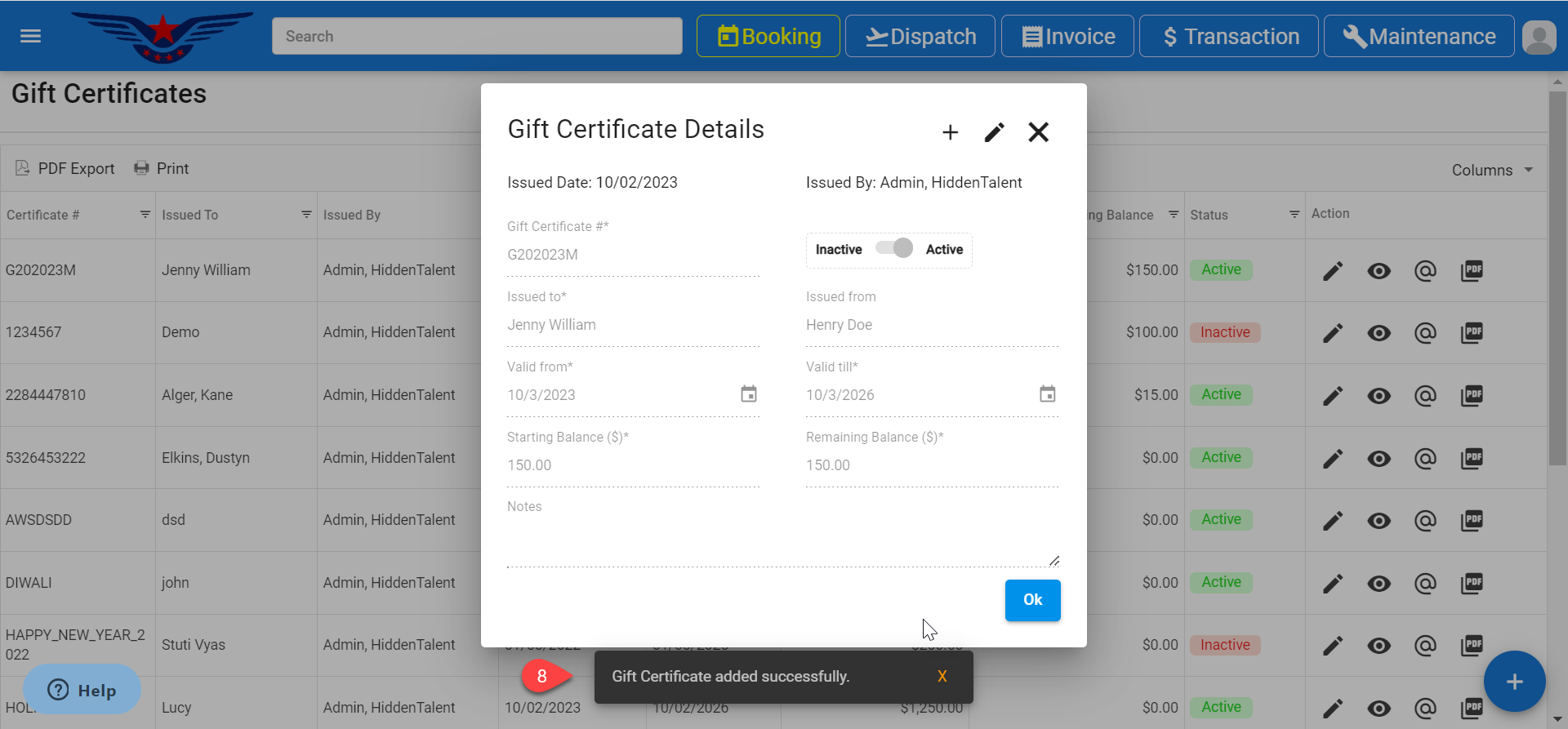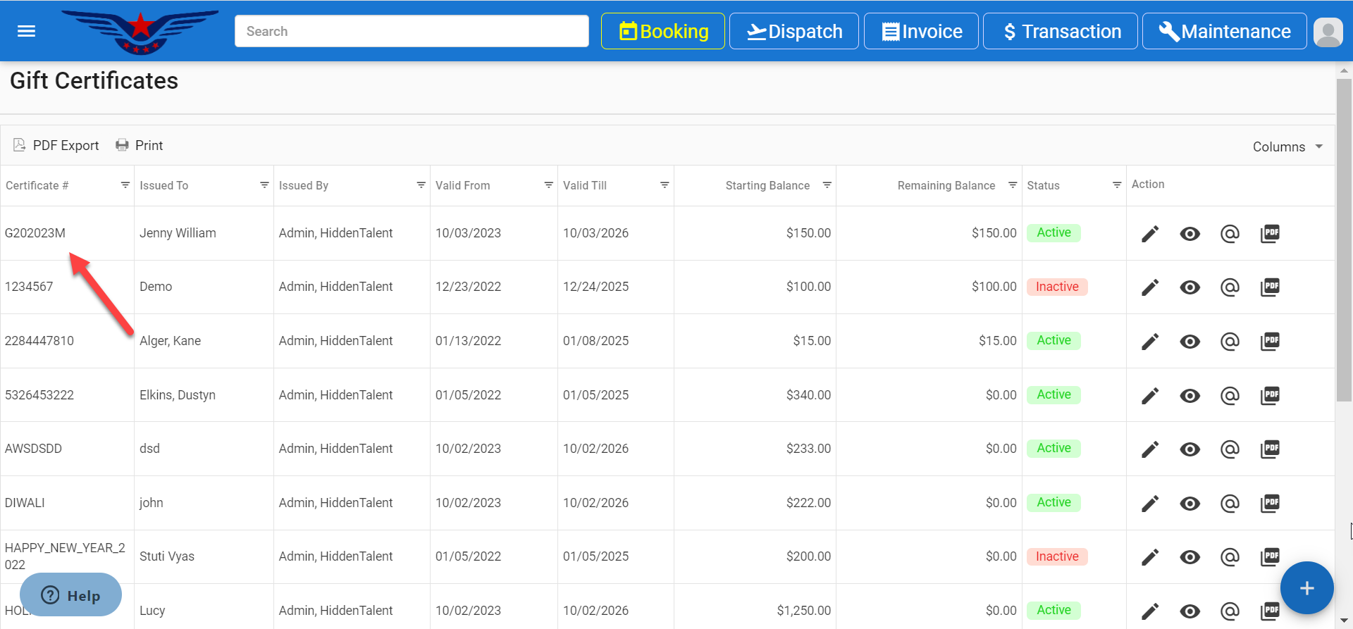 - The newly created gift certificate will be displayed on the top of the list.