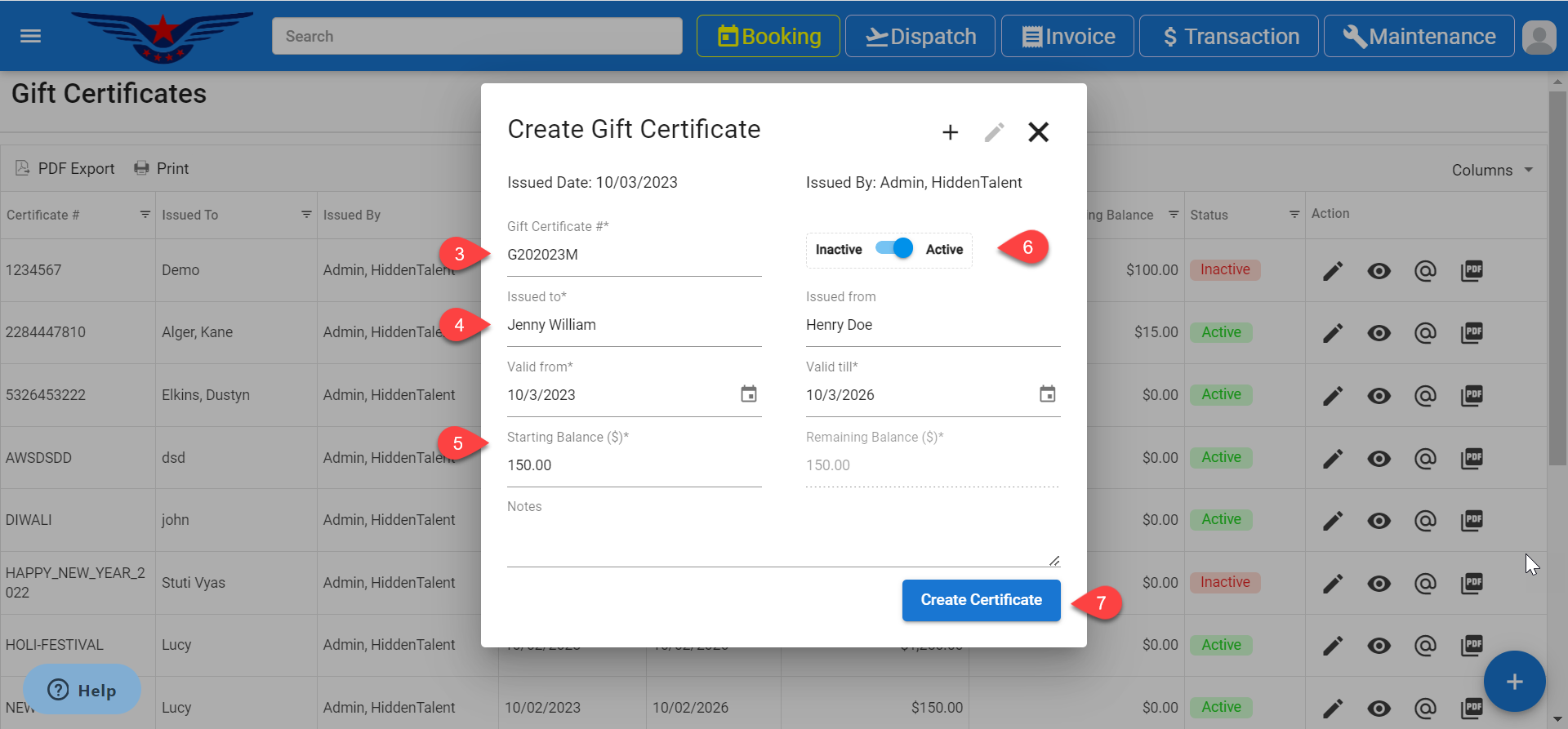 - A sheet to create gift certificate will be displayed. Enter the Gift Certificate # (at least 6 alphanumeric characters).