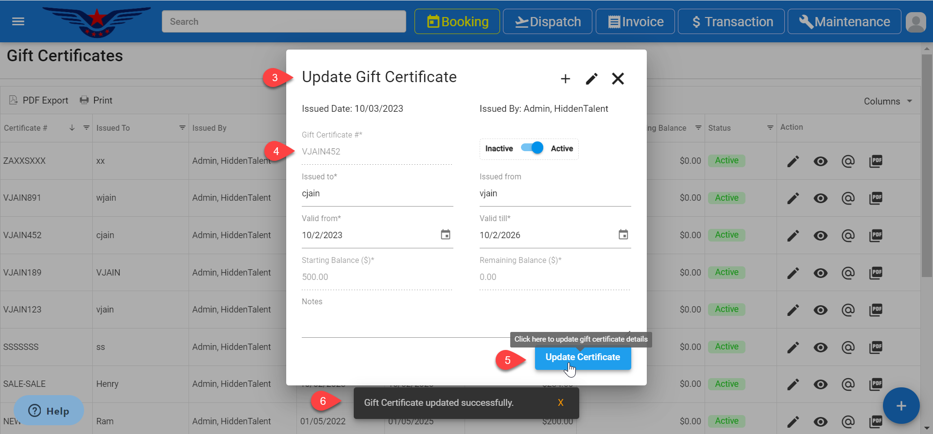 - Gift Certificate #, Starting Balance($), Remaining Balance($) can not be edit. Make the desired changes in remaining fields.