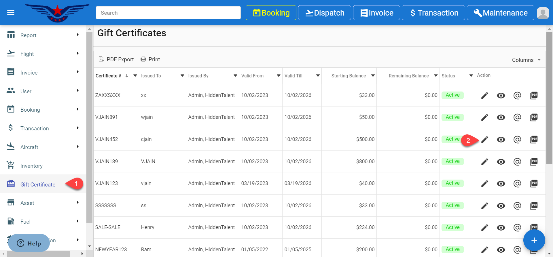 - Gift Certificate list will be displayed. Click on the Pen icon corresponding to desired gift certificate.