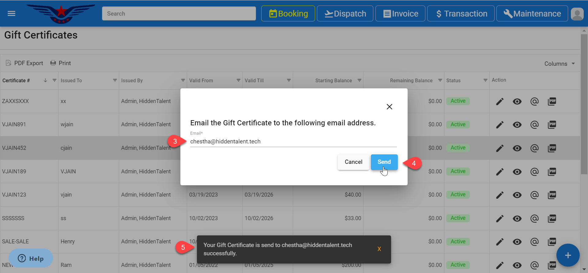 - Gift Certificate list will be displayed. Click on the @ icon corresponding to desired gift certificate.